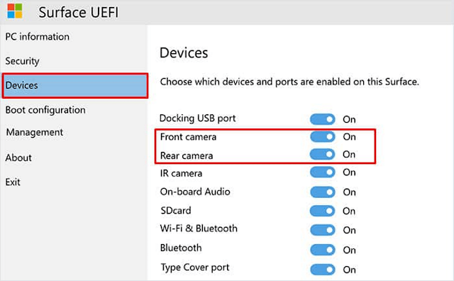 进入 Surface UEFI 界面,选择 Devices,重新启用 Camera Front,Camera Rear,IR Camera Front 即可。