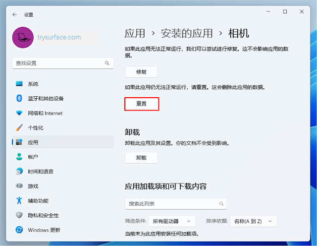 进入 Windows 设置 > 应用 > 应用和功能 > 相机,选择高级选项,点击“重置”在 UEFI 中重新启用 Surface 相机功能