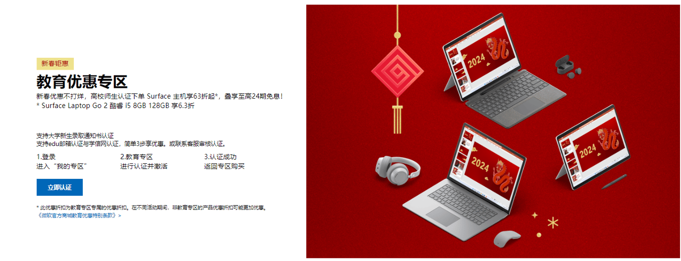 微软为教职工以及学生群体了提供了教育优惠(地址:微软教育专区),一般情况下,Surface 设备(新机)会享受 9 折以及 24 期免息分期,特定 Surface 设备会有更低的折扣。