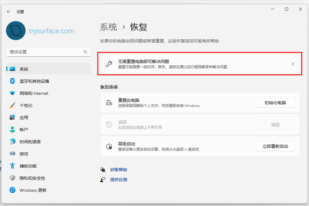 进入 Windows 设置 > Windows 更新 > 高级选项 > 恢复 页面,选择 “无需重置电脑即可解决问题”。如无效,请做好设备备份工作选择“初始化电脑”。