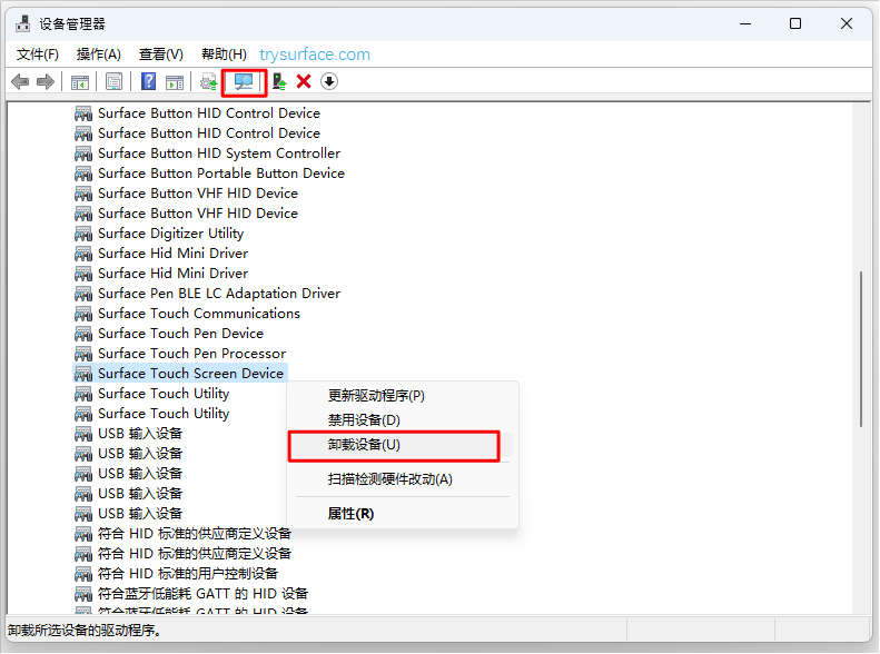 按下 Windows + X,找到设备管理器并,在设备管理器找到 “Surface Touch Screen Device” 并右击选择卸载。卸载完成后点击“扫描电脑”图标来获取更新,或者前往官网(Surface驱动下载官网传送门)手动下载和安装驱动更新。使用 Surface 诊断工具修复